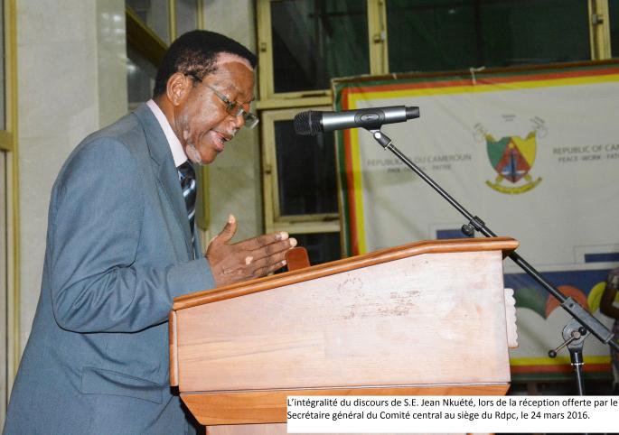 Bref, aujourd’hui 24 mars 2016, nous lui réaffirmons fièrement que le RDPC sera toujours là pour lui apporter les soutiens appropriés en vue de la réussite du seul vrai combat qui vaille la peine dans la vie des Etats et des nations, le combat pour l’émergence entendue comme le progrès et le bien-être des populations.